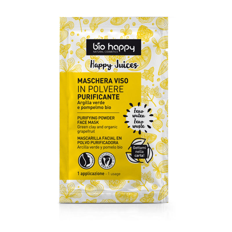 Se zeleným jílem a bio grepovým esenciálním olejem, maska na obličej v prášku Happy Juice delikátně působí na regulaci mazu smíšené a nečisté pleti.